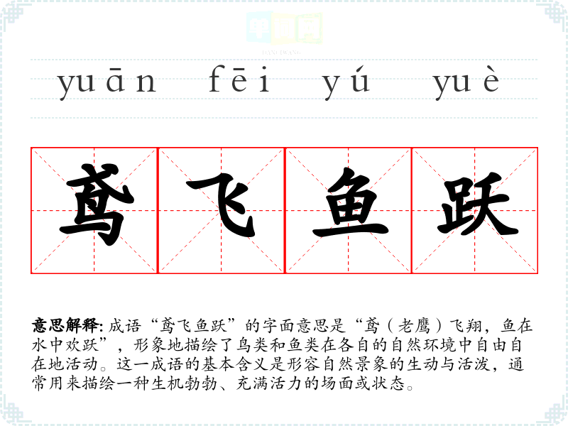 成语“鸢飞鱼跃”的字面意思是“鸢(老鹰)飞翔,鱼在水中欢跃”,形象地描绘了鸟类和鱼类在各自的自然环境中自由自在地活动。这一成语的基本含义是形容自然景象的生动与活泼,通常用来描绘一种生机勃勃、充满活力的场面或状态。