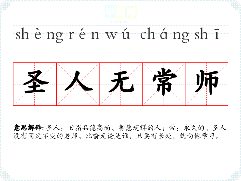 圣人:旧指品德高尚、智慧超群的人;常:永久的。圣人没有固定不变的老师。比喻无论是谁,只要有长处,就向他学习。