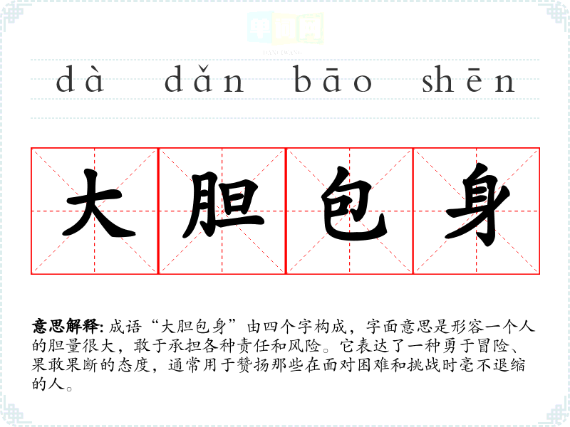 成语“大胆包身”由四个字构成,字面意思是形容一个人的胆量很大,敢于承担各种责任和风险。它表达了一种勇于冒险、果敢果断的态度,通常用于赞扬那些在面对困难和挑战时毫不退缩的人。