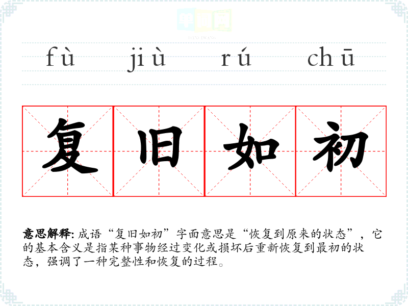 | 复旧如初 | 复:恢复;如:像,好像。恢复旧的,就像当初一样。 |