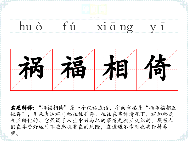 “祸福相倚”是一个汉语成语,字面意思是“祸与福相互依存”,用来表达祸与福往往并存,往往在某种情况下,祸和福是相互转化的。它强调了人生中好与坏的事情是相互交织的,提醒人们在享受好运时不应忽视潜在的风险,在遭遇不幸时也要保持希望。