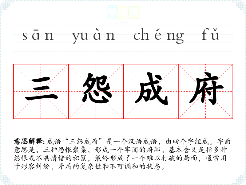 成语“三怨成府”是一个汉语成语,由四个字组成。字面意思是,三种怨恨聚集,形成一个牢固的府邸。基本含义是指多种怨恨或不满情绪的积累,最终形成了一个难以打破的局面,通常用于形容纠纷、矛盾的复杂性和不可调和的状态。