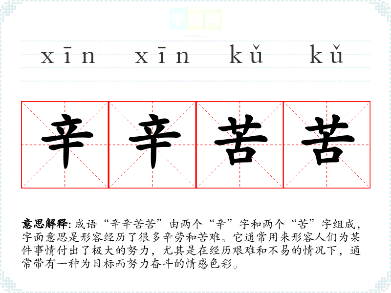 成语“辛辛苦苦”由两个“辛”字和两个“苦”字组成,字面意思是形容经历了很多辛劳和苦难。它通常用来形容人们为某件事情付出了极大的努力,尤其是在经历艰难和不易的情况下,通常带有一种为目标而努力奋斗的情感色彩。