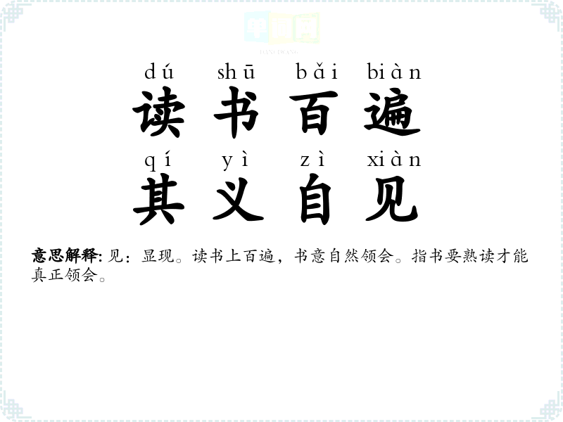 | 读书百遍,其义自见 | 见:显现。读书上百遍,书意自然领会。指书要熟读才能真正领会。 |