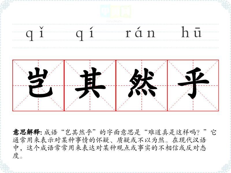 成语“岂其然乎”的字面意思是“难道真是这样吗?”它通常用来表示对某种事情的怀疑、质疑或不以为然。在现代汉语中,这个成语常常用来表达对某种观点或事实的不相信或反对态度。