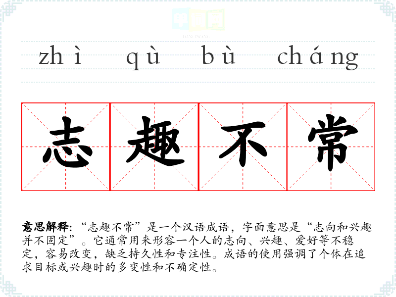 “志趣不常”并没有明确的历史出处,但其构成的“志趣”二字在古代文献中有广泛的应用,通常用于描述个人的理想与兴趣。而“不常”则表明了这种状态的变化和不稳定性。该成语可以被视为对古代士人志向的反思,反映了在追求理想过程中可能遭遇的困惑和动摇。
