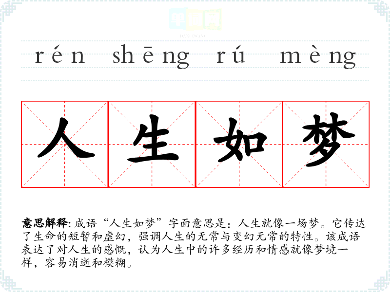 通过对“人生如梦”的学*,我更加深刻地理解了生命的意义与价值。这个成语不仅丰富了我的语言表达,也让我在生活中学会了珍惜与感悟。它提醒我,无论生活多么忙碌,都要停下来思考,享受当下,留下美好的回忆。