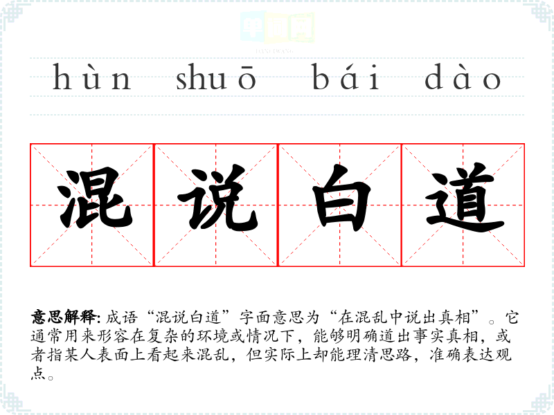 成语“混说白道”字面意思为“在混乱中说出真相”。它通常用来形容在复杂的环境或情况下,能够明确道出事实真相,或者指某人表面上看起来混乱,但实际上却能理清思路,准确表达观点。