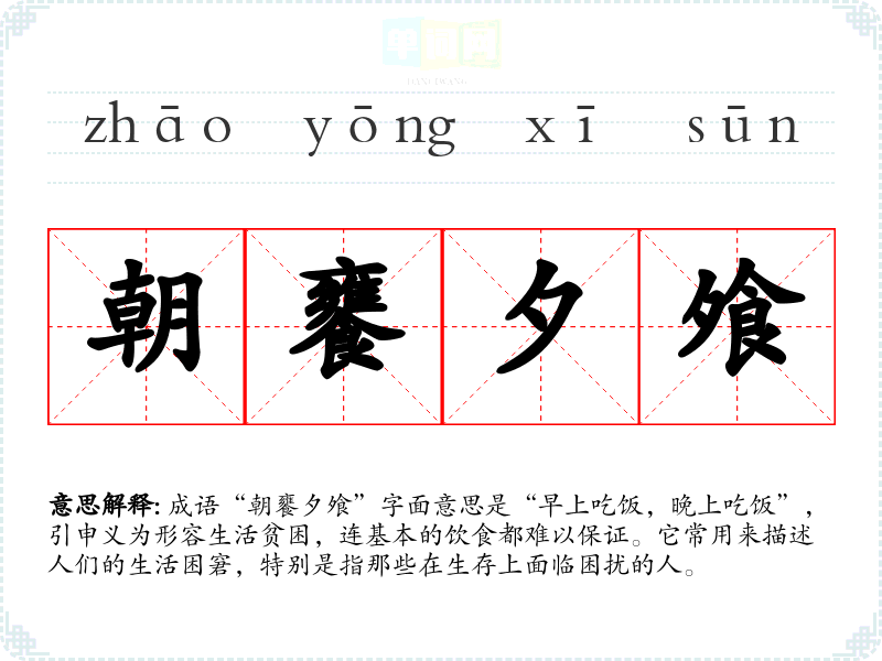 成语“朝饔夕飧”字面意思是“早上吃饭,晚上吃饭”,引申义为形容生活贫困,连基本的饮食都难以保证。它常用来描述人们的生活困窘,特别是指那些在生存上面临困扰的人。