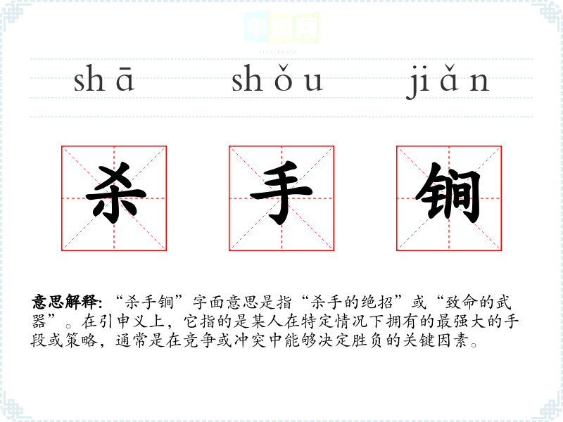 “杀手锏”字面意思是指“杀手的绝招”或“致命的武器”。在引申义上,它指的是某人在特定情况下拥有的最强大的手段或策略,通常是在竞争或冲突中能够决定胜负的关键因素。