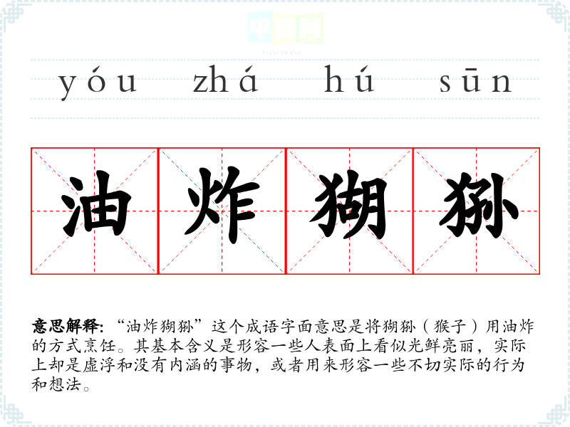 “油炸猢狲”这个成语字面意思是将猢狲(猴子)用油炸的方式烹饪。其基本含义是形容一些人表面上看似光鲜亮丽,实际上却是虚浮和没有内涵的事物,或者用来形容一些不切实际的行为和想法。