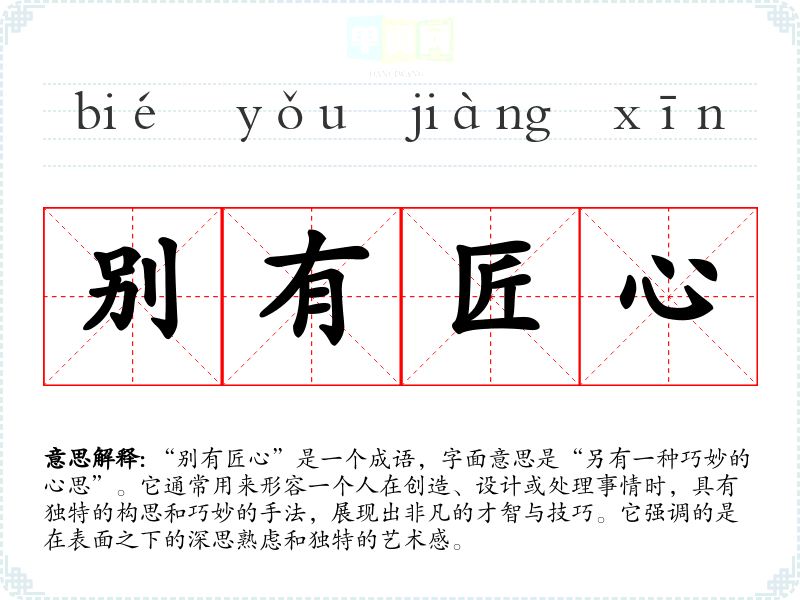 “别有匠心”出自唐代诗人李白的《赠孟浩然》,其中有“别有洞天”的说法。其意在于表达人们在创作或思考时,能够超越常规,展现出独特的风格或思维方式。这种用法逐渐演变为对具有独特创意的人的赞美,象征着匠心独运的艺术风格。