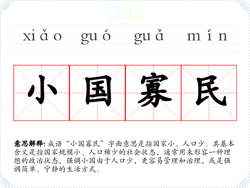 成语“小国寡民”字面意思是指国家小、人口少。其基本含义是指国家规模小、人口稀少的社会状态,通常用来形容一种理想的政治状态,强调小国由于人口少,更容易管理和治理,或是强调简单、宁静的生活方式。