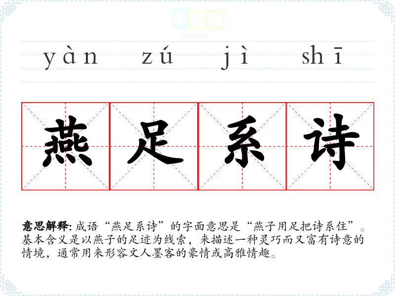 成语“燕足系诗”的字面意思是“燕子用足把诗系住”。基本含义是以燕子的足迹为线索,来描述一种灵巧而又富有诗意的情境,通常用来形容文人墨客的豪情或高雅情趣。