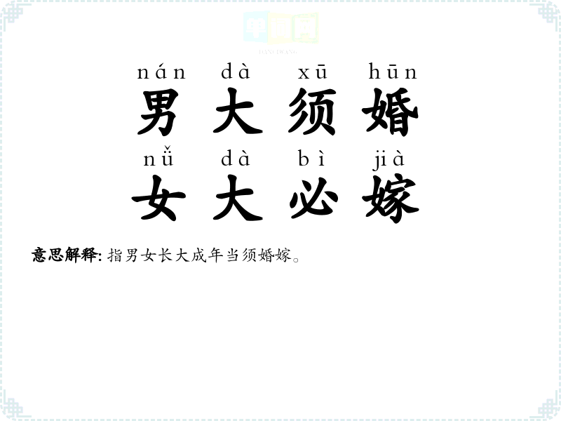 | 男大当婚,女大须嫁 | 婚:指男子娶妻。指男女长大成年当须婚嫁。 |