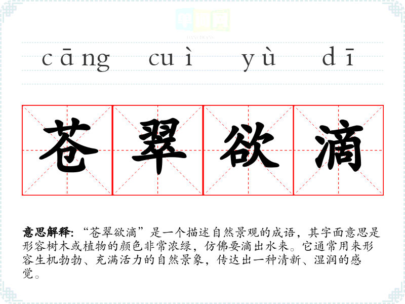 “苍翠欲滴”是一个描述自然景观的成语,其字面意思是形容树木或植物的颜色非常浓绿,仿佛要滴出水来。它通常用来形容生机勃勃、充满活力的自然景象,传达出一种清新、湿润的感觉。