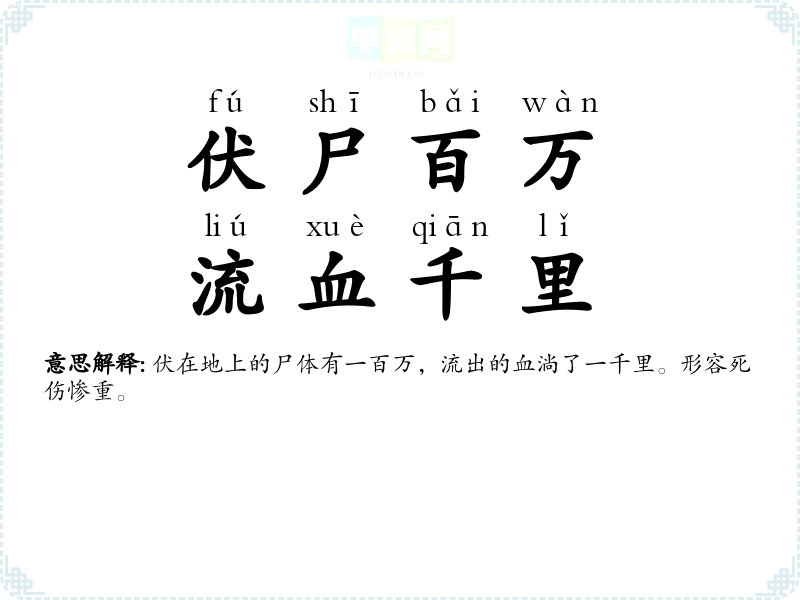 | 伏尸百万 | 伏在地上的尸体有一百万。形容死伤惨重。 |