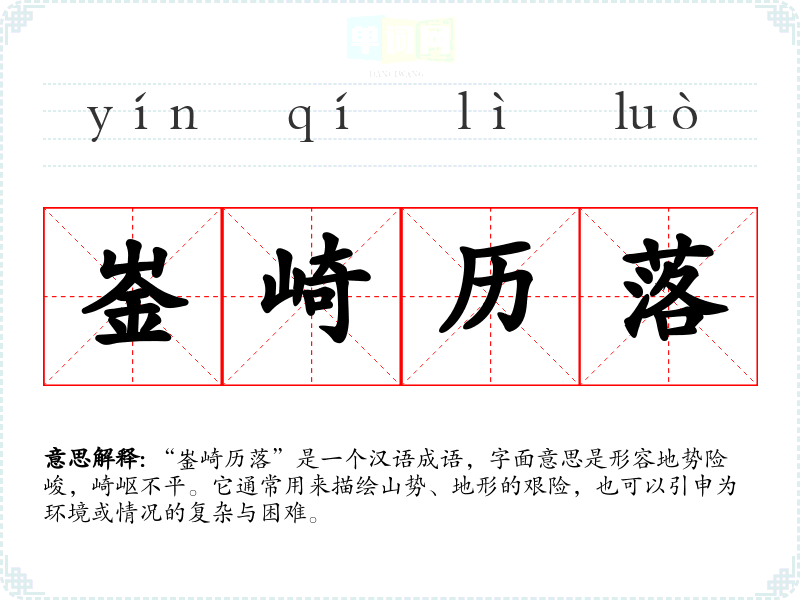 “崟崎历落”是一个汉语成语,字面意思是形容地势险峻,崎岖不平。它通常用来描绘山势、地形的艰险,也可以引申为环境或情况的复杂与困难。