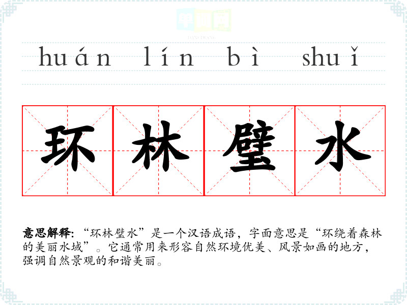 “环林璧水”是一个汉语成语,字面意思是“环绕着森林的美丽水域”。它通常用来形容自然环境优美、风景如画的地方,强调自然景观的和谐美丽。