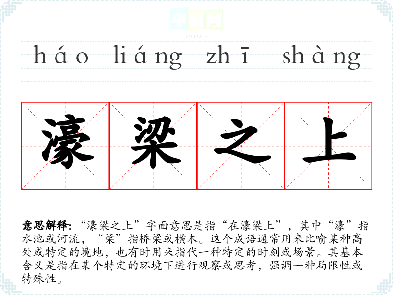 “濠梁之上”字面意思是指“在濠梁上”,其中“濠”指水池或河流,“梁”指桥梁或横木。这个成语通常用来比喻某种高处或特定的境地,也有时用来指代一种特定的时刻或场景。其基本含义是指在某个特定的环境下进行观察或思考,强调一种局限性或特殊性。