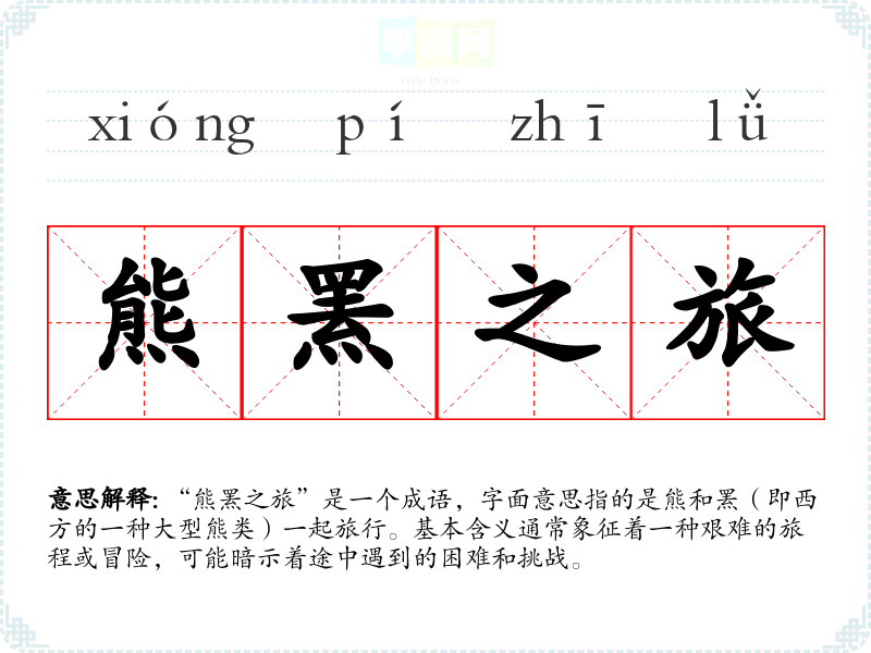 该成语并没有明确的历史背景和文学出处,但可以从字面意义推测与大自然中的野生动物和探险精神相关。熊和罴都是象征力量和勇气的动物,它们一起旅行的画面可以理解为一种勇敢探索未知的精神。
