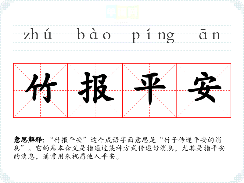 “竹报平安”这个成语字面意思是“竹子传递平安的消息”。它的基本含义是指通过某种方式传递好消息,尤其是指平安的消息,通常用来祝愿他人平安。