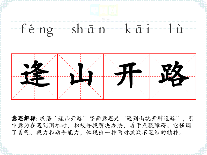 成语“逢山开路”字面意思是“遇到山就开辟道路”,引申意为在遇到困难时,积极寻找解决办法,勇于克服障碍。它强调了勇气、毅力和动手能力,体现出一种面对挑战不退缩的精神。