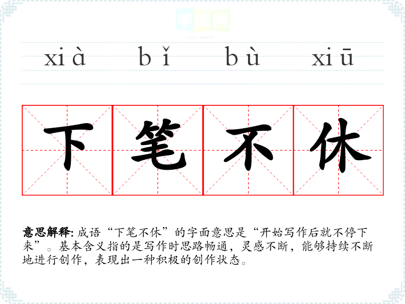 成语“下笔不休”的字面意思是“开始写作后就不停下来”。基本含义指的是写作时思路畅通,灵感不断,能够持续不断地进行创作,表现出一种积极的创作状态。