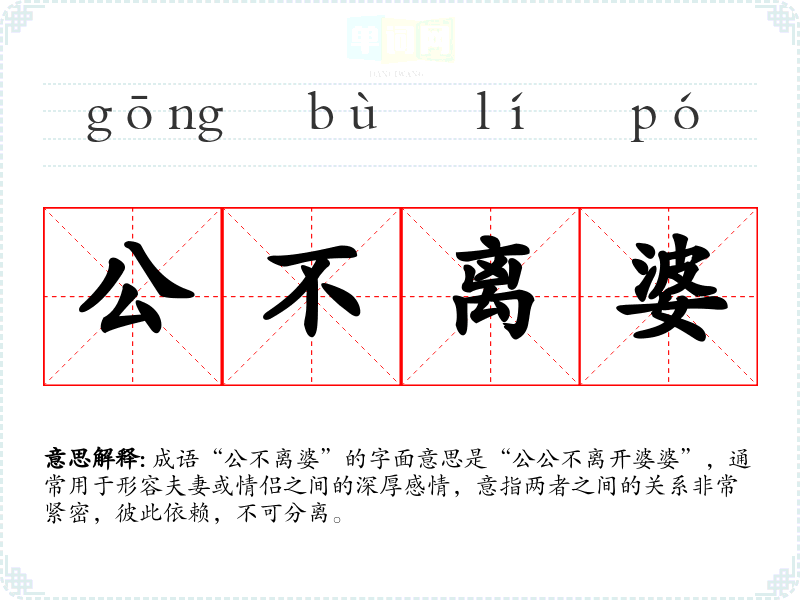 成语“公不离婆”的字面意思是“公公不离开婆婆”,通常用于形容夫妻或情侣之间的深厚感情,意指两者之间的关系非常紧密,彼此依赖,不可分离。
