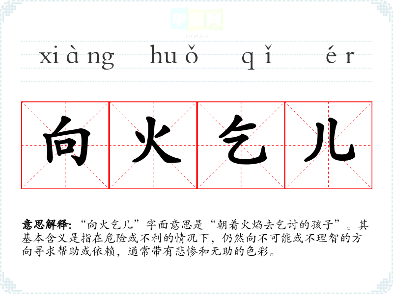 “向火乞儿”字面意思是“朝着火焰去乞讨的孩子”。其基本含义是指在危险或不利的情况下,仍然向不可能或不理智的方向寻求帮助或依赖,通常带有悲惨和无助的色彩。