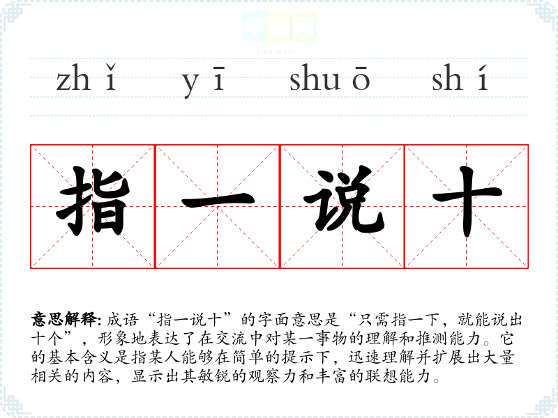 成语“指一说十”的字面意思是“只需指一下,就能说出十个”,形象地表达了在交流中对某一事物的理解和推测能力。它的基本含义是指某人能够在简单的提示下,迅速理解并扩展出大量相关的内容,显示出其敏锐的观察力和丰富的联想能力。