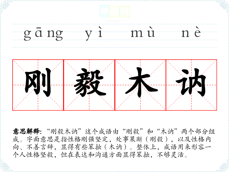 “刚毅木讷”这个成语由“刚毅”和“木讷”两个部分组成。字面意思是指性格刚强坚定,处事果断(刚毅),以及性格内向、不善言辞,显得有些笨拙(木讷)。整体上,成语用来形容一个人性格坚毅,但在表达和沟通方面显得笨拙,不够灵活。