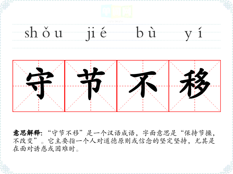 “守节不移”是一个汉语成语,字面意思是“保持节操,不改变”。它主要指一个人对道德原则或信念的坚定坚持,尤其是在面对诱惑或困难时。