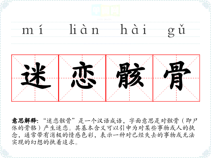 “迷恋骸骨”是一个汉语成语,字面意思是对骸骨(即尸体的骨骼)产生迷恋。其基本含义可以引申为对某些事物或人的执念,通常带有消极的情感色彩,表示一种对已经失去的事物或无法实现的幻想的执着追求。