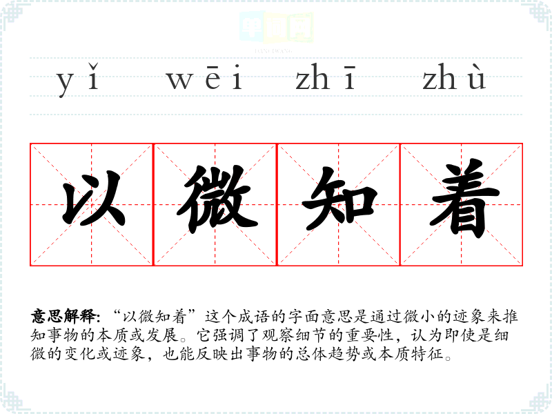 “以微知着”这个成语的字面意思是通过微小的迹象来推知事物的本质或发展。它强调了观察细节的重要性,认为即使是细微的变化或迹象,也能反映出事物的总体趋势或本质特征。