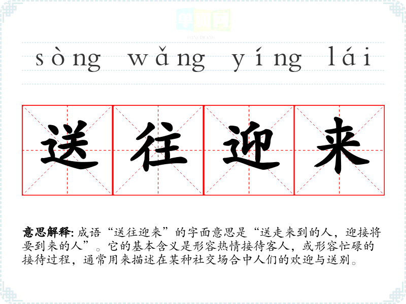 成语“送往迎来”的字面意思是“送走来到的人,迎接将要到来的人”。它的基本含义是形容热情接待客人,或形容忙碌的接待过程,通常用来描述在某种社交场合中人们的欢迎与送别。