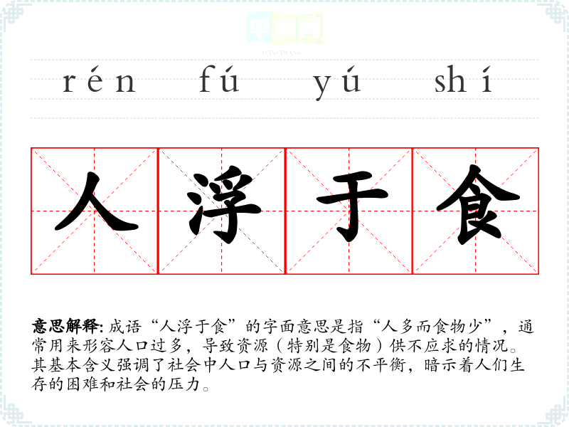 成语“人浮于食”的字面意思是指“人多而食物少”,通常用来形容人口过多,导致资源(特别是食物)供不应求的情况。其基本含义强调了社会中人口与资源之间的不平衡,暗示着人们生存的困难和社会的压力。