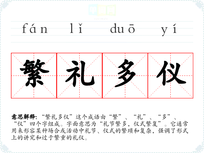 “繁礼多仪”这个成语由“繁”、“礼”、“多”、“仪”四个字组成。字面意思为“礼节繁多,仪式繁复”。它通常用来形容某种场合或活动中礼节、仪式的繁琐和复杂,强调了形式上的讲究和过于繁重的礼仪。