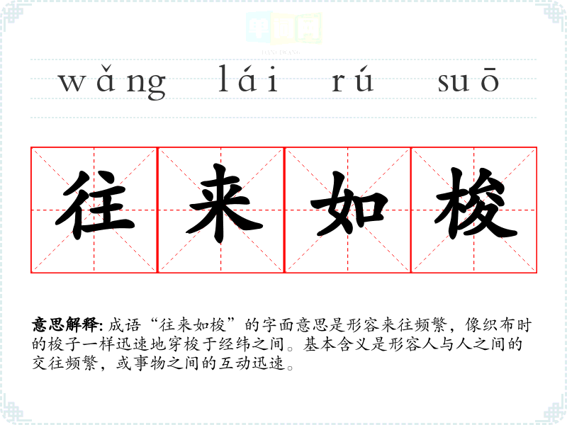 成语“往来如梭”的字面意思是形容来往频繁,像织布时的梭子一样迅速地穿梭于经纬之间。基本含义是形容人与人之间的交往频繁,或事物之间的互动迅速。