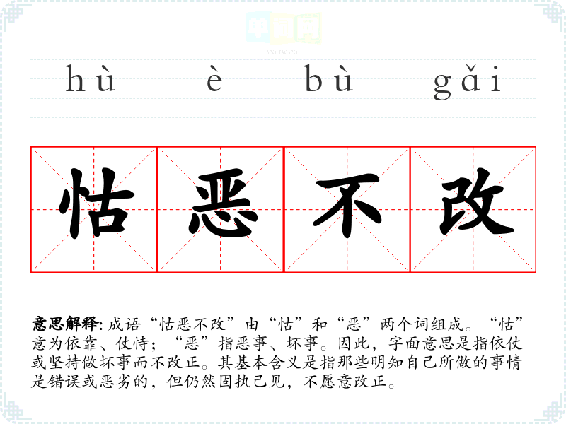 | 怙恶不改 | 怙:坚持。坚持作恶,不肯悔改。 |