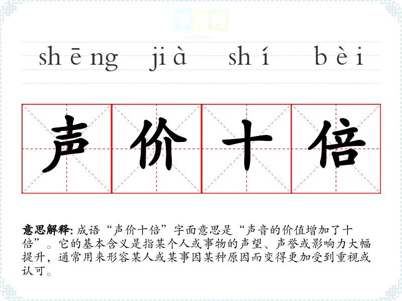 成语“声价十倍”字面意思是“声音的价值增加了十倍”。它的基本含义是指某个人或事物的声望、声誉或影响力大幅提升,通常用来形容某人或某事因某种原因而变得更加受到重视或认可。