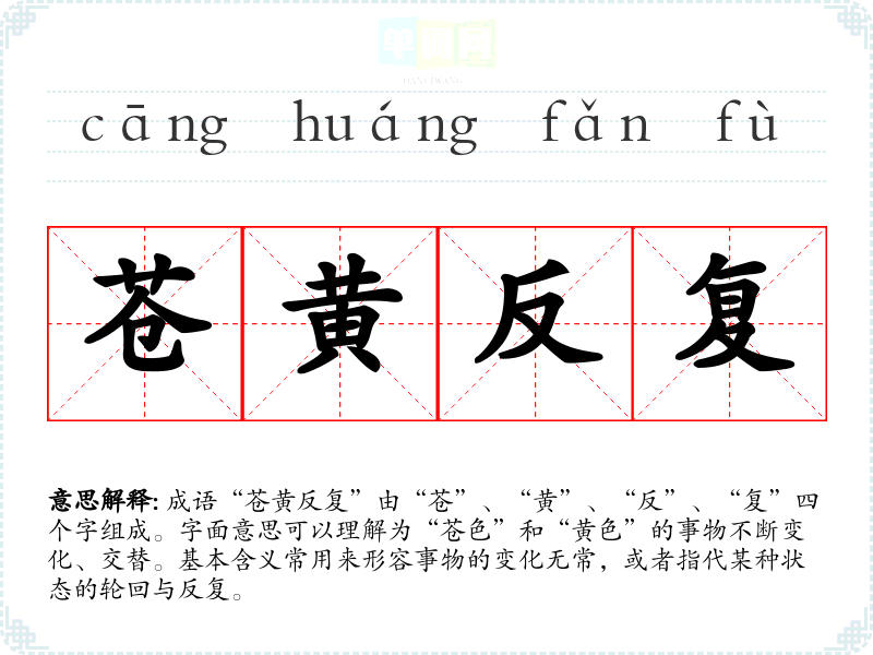 成语“苍黄反复”由“苍”、“黄”、“反”、“复”四个字组成。字面意思可以理解为“苍色”和“黄色”的事物不断变化、交替。基本含义常用来形容事物的变化无常,或者指代某种状态的轮回与反复。