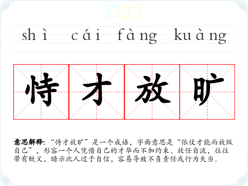 “恃才放旷”是一个成语,字面意思是“依仗才能而放纵自己”,形容一个人凭借自己的才华而不加约束、放任自流,往往带有贬义,暗示此人过于自信,容易导致不负责任或行为失当。