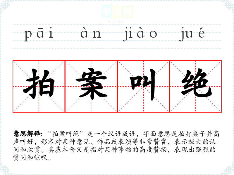 “拍案叫绝”是一个汉语成语,字面意思是拍打桌子并高声叫好,形容对某种意见、作品或表演等非常赞赏,表示极大的认同和欣赏。其基本含义是指对某种事物的高度赞扬,表现出强烈的赞同和惊叹。