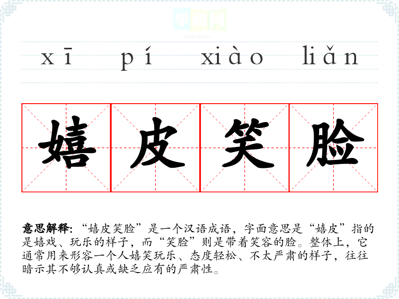 | 嬉皮笑脸 | 形容嬉笑不严肃的样子。 |
