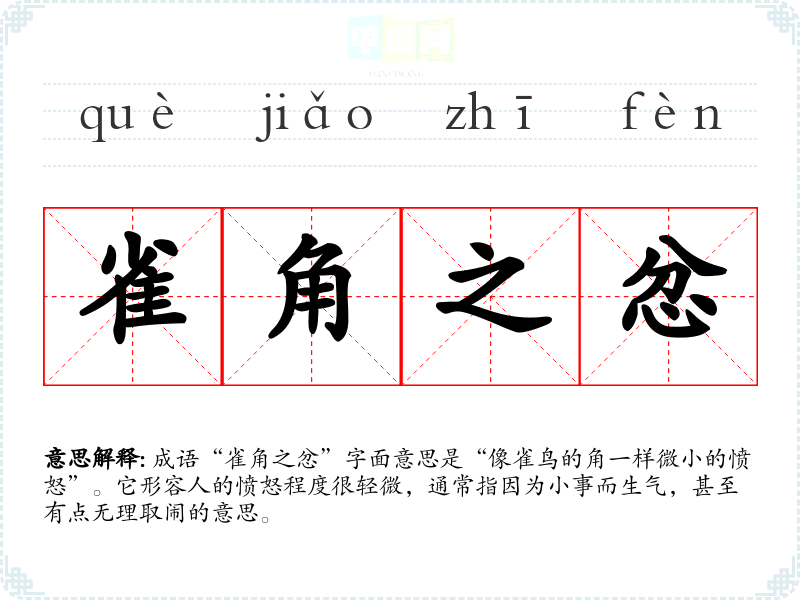 成语“雀角之忿”字面意思是“像雀鸟的角一样微小的愤怒”。它形容人的愤怒程度很轻微,通常指因为小事而生气,甚至有点无理取闹的意思。