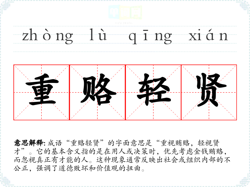 成语“重赂轻贤”的字面意思是“重视贿赂,轻视贤才”。它的基本含义指的是在用人或决策时,优先考虑金钱贿赂,而忽视真正有才能的人。这种现象通常反映出社会或组织内部的不公正,强调了道德败坏和价值观的扭曲。