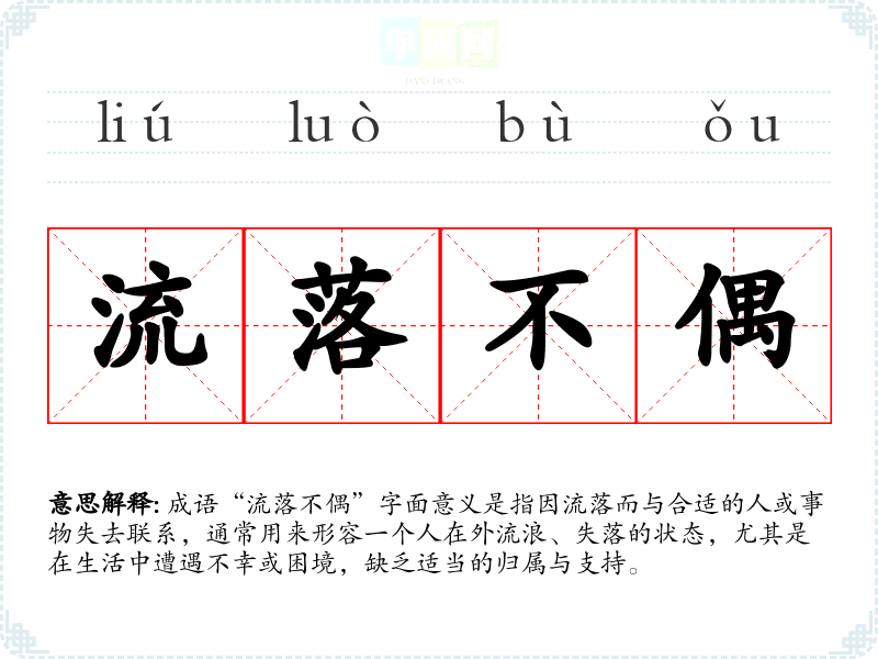 成语“流落不偶”字面意义是指因流落而与合适的人或事物失去联系,通常用来形容一个人在外流浪、失落的状态,尤其是在生活中遭遇不幸或困境,缺乏适当的归属与支持。