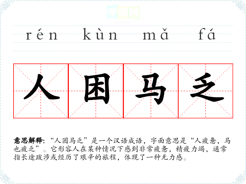 “人困马乏”是一个汉语成语,字面意思是“人疲惫,马也疲乏”。它形容人在某种情况下感到非常疲惫,精疲力竭,通常指长途跋涉或经历了艰辛的旅程,体现了一种无力感。