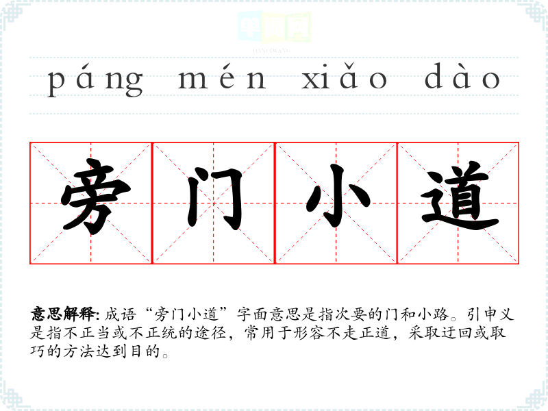 成语“旁门小道”字面意思是指次要的门和小路。引申义是指不正当或不正统的途径,常用于形容不走正道,采取迂回或取巧的方法达到目的。
